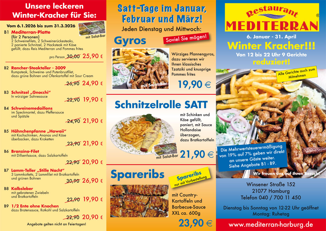 Winsener Straße 152 21077 Hamburg-Harburg Öffnungszeiten: Ab 2020 Montag Ruhetag außer an Feiertagen Di - So: 12:00-23:00 Uhr Tel.: 040-70011450 info@mediterran-harburg.de Datenschutzerklärung